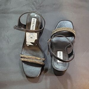 BRAND NEW STEVE MADDEN DOUBLE STRAP OPEN SQUARE TOE WOMEN"S SANDAL SIZE 9M COLOR BLACK WITH SILVER STUDS ADJUSTABLE BUCKLE STRAP CLOSURE MADE WITH ALL MAN-MADE MATERIALS LINING BALANCE MAN MADE CUSHIONED FOOTBED INSOLE HEEL HEIGHT MEASUREMENTS APPROX 4"INCHES THIS ITEMS IS BRAND NEW WITH TAG NO BOX CHECK THE PICTURES(FYI THE FIRST PICTURES IS JUST A MODEL TO SHOW WHAT THE SHOE LOOK ON CHECK THE PICTURES)