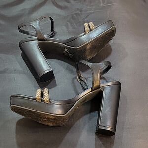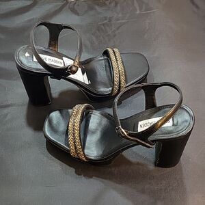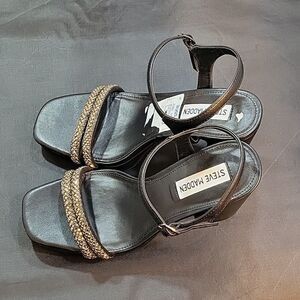 BRAND NEW STEVE MADDEN DOUBLE STRAP OPEN SQUARE TOE WOMEN"S SANDAL SIZE 6M COLOR BLACK WITH SILVER STUDS ADJUSTABLE BUCKLE STRAP CLOSURE MADE WITH ALL MAN-MADE MATERIALS LINING BALANCE MAN MADE CUSHIONED FOOTBED INSOLE HEEL HEIGHT MEASUREMENTS APPROX 4"INCHES THIS ITEMS IS BRAND NEW WITH TAG NO BOX CHECK THE PICTURES