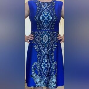 BRAND NEW STUDIO ONE VINTAGES PRINT DESIGN DRESS SIZE 6P COLOR ROYAL BLUE WITH WHITE &BLACK IN THE VINTAGES DESIGN SLEEVELESS ROUND NECKLINE INVISIBLE BACK ZIPPER CLOSURE ABOVE THE KNEE LENGTH MADE WITH 100%POLYESTER 4%SPANDEX LINING/ FORRO 100%POLYESTER THIS ITEMS IS BRAND NEW WITHOUT TAG CHECK THE PICTURES