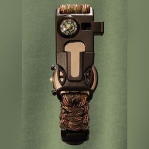 THIS BRACELET WATCH HAS HUNDREDS OF USES! USE THE WHISTLE TO CALLED FOR HELP, USE THE COMPASS TO FIND YOUR WAY BACK TO CIVILIZATION, OR YOU CAN USE THE BLADE AND FLINT TO START A FIRE TO STAY WARM OR SIGNAL FOR HELP. THE BAND OF THIS WATCH CAN BE QUICKLY DISASSEMBLED INTO AN UMBRELLA ROPE THAT CAN WITHSTAND UP TOO 250 LBS OF WEIGHT. KNITTED UP BY SEVERAL FEET OF PARACORD WHICH CAN BE USED IN AN EMERGENCY. KEEP ONE IN YOUR CAR, SURVIVAL BAG.. IDEAL ACCESSORY FOR CAMPING, BOATING, HUNTING, HIKING, AND OR OTHER SPORTS ACTIVITIES.