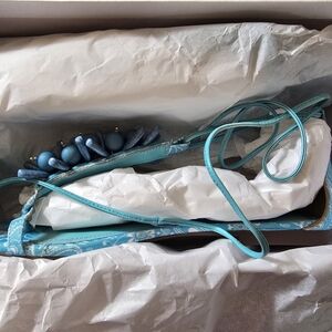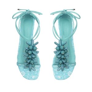 Never Worn Schutz Sasha Fabric sandal. Embellished center strap. Flat heel. Lace up. Square toe. River Aqua