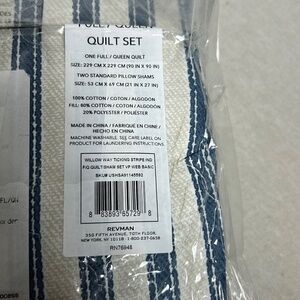 Classic Stone Cottage “Willow Way” Ticking Stripe Quilt Set in navy and white — includes 1 full/queen quilt and 2 standard pillow shams. Made with 100% cotton fabric and an 80/20 cotton-poly fill for a soft, breathable, and durable finish. Perfect for a cozy farmhouse, cottage, or coastal-style bedroom.