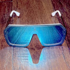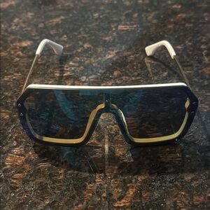 Trendy sunglasses with a blue and gold frame. Perfect for a chic look.