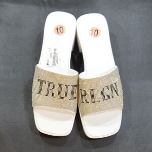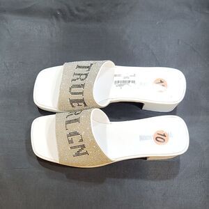 BRAND NEW TRUE RELIGION EMBELLISHMENTS BLOCK HEEL MULE OPEN GLITTER EMBROIDERY SANDAL SIZE 10 COLOR WHITE SILVER WRITING MADE WITH FUSPV SYNTHETIC UPPER SYNTHETIC SOLE HEEL HEIGHT MEASUREMENTS APPROX 2"INCHES THIS ITEMS IS BRAND NEW WITH TAG CHECK THE PICTURES