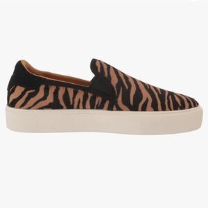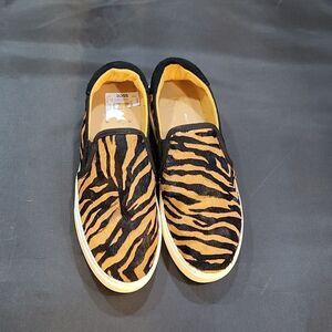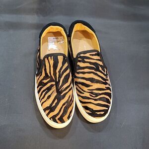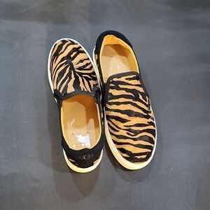 BRAND NEW UGG WOMEN'S CARAVAN TIGER PRINT SNEAKER SIZE 7 COLOR BLACK &TAN Tiger-print calf hair adds wild style to this statement sneaker. Offering easy slip-on entry with dual elastic gore, its lightweight rubber cupsole and cushioned foam footbed deliver a smooth ride for all-day wear.Printed calf hair upper Twin gore Synthetic lining, Textile lining