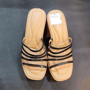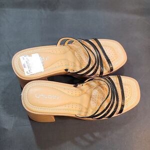 BRAND NEW UNILODY MULTI STRAP BLOCK HEEL WOMEN'S MULTI-STRAPS MULES SIZE 71/2 COLOR BLACK STRAP WITH CORK BOTTOM sculptural block heel all man-made materials lining upper balance man made materials cushioning footbed platform silhouette platform mule slides embellished strap round open-toe heel height measurements apron 4"inched THIS ITEMS IS BRAND NEW WITH TAG NO BOX CHECK THE PICTURES
