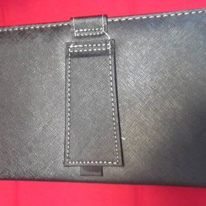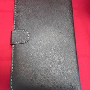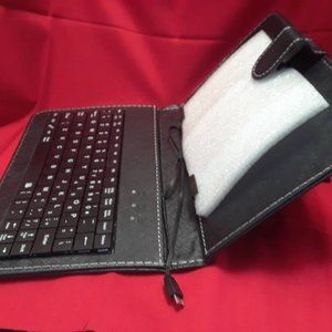 This is a BRAND NEW TABLET CASE with a keyboard, to make entries much easier! It is made of black, textured PU leather and has a kick stand on the back for a better viewing angle. It has a built-in micro usb connector for the keyboard.