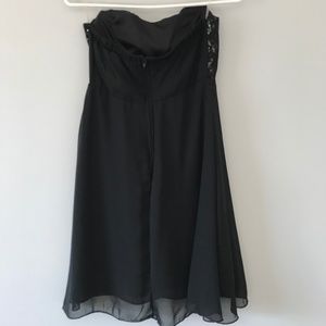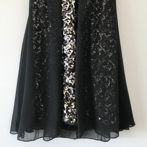 Beautiful Black and Gold strapless dress from Van Maur. Perfect for homecoming. The tule on the front opens up and is flowy, but attached at the top to cover the boob area. The inside feels really silky not scratchy which I was worried about because of the sequins. Never worn because I decided on a different dress.