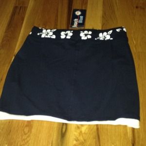 Very pretty navy blue skirt with Hawaiian flowers on the waist band. Perfect for the beach or summer in general.