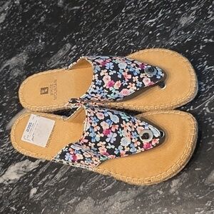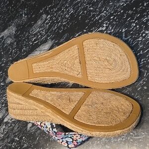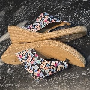 2.25" Heel heightStep into style with these chic floral wedge sandals. Perfect for any casual outing, these sandals feature a vibrant floral design on a comfortable wedge heel. The black base complements the colorful floral pattern, making them a versatile addition to your wardrobe.THIS ITEMS IS BRAND NEW WITH TAG NO BOX CHECK THE PICTURES