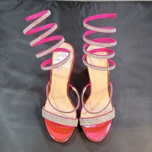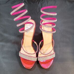 BRAND NEW WILD DIVA LOUNGS RHINESTONES EMBELLISHMENTS SANDAL SIZE 8 COLOR PINK &SILVER SEQUIM featuring a round toe double strap Block Heels Rhinestone Vamp Open Toe Wrap Around Rhinestone Ankle Straps Platform Sole,made with all man-made materials lining upper balance man made materials lining sock textile man-made Approx. 1"inched platform and Heel Height measurements approximately 4" inches styles piral List With Two Rows Of Fashionable Rhinestone sandal Popular style THIS ITEMS IS BRAND NEW WITH TAG NO BOX CHECK THE PICTURES