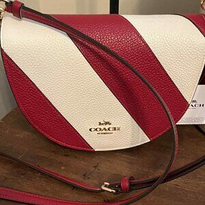 This is an absolutely adorable bag! It reminds me of a candy cane. It is a Coach bag pieced with red/chalk leather. It has never been used and still has some of the original packaging. The tag is still attached, however, with the price removed. This is from a smoke free/pet friendly environment.