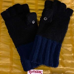 BRAND NEW WITH TAGS Convertible Mittens, women’s sized. Black and navy blue knit mittens that fold back into fingerless gloves. Mittens fold back and are held down with a button. SUPER CUTE!!