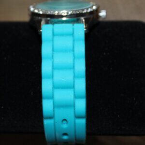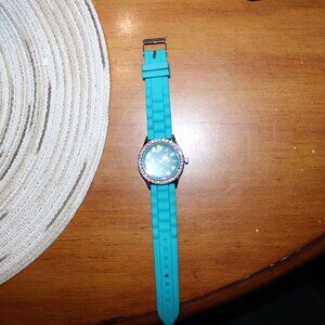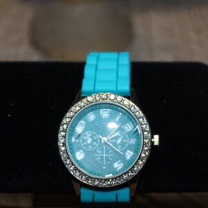 I am cleaning out my jewelry. This is BRAND NEW without tags. It is a great blue color light in weight, stainless steel, bling around the watch face, second hand. I just put a brand-new battery in it. That cost me $10. Comes from a smoke free home. Has been stored very safely in watch box.