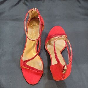 BRAND NEW YORK JESSICA SIMPSON HIGH HEEL STILETTOS SANDAL SIZE 9M/40 COLOR RED Heeled Sandals from Jessica Simpson, Open Toe, Party Style, Elegant Style, Casual Style, Street Style, Chain, Blended Fabrics, Clear Flame, Bridal, Strap Sandals, Street Style, Chain,Heel Height over 10cm heel height measurements approximately 4"inched" stiletto heel; 1/2" platform Round-toe ankle-strap dress sandals with adjustable buckle closure suede upper manmade lining; leather sole covers heel Strappy sandals with a metallic finish feature a sky-high design with back and ankle strap.Metallic textile upper Open toe back closure Adjustable ankle strap buckle closure Synthetic padded insole Synthetic soleSole material Rubber Outer material Textile Closure type Buckle