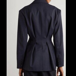 GAUCHERE designer Marie-Christine Statz is well-versed in tailoring and has a talent for making styles like this 'Rachel' blazer feel really cool and confident. Tailored in the label's French atelier, it's cut from navy wool-blend gabardine that's trimmed with black satin and sharply pleated at the back to create an exaggerated nipped-in waist. Switch between wearing it with wide-leg pants and cycling shorts.
