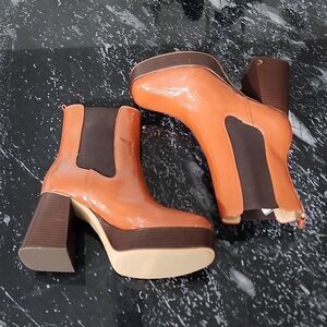 BRAND NEW CIRCUS BY SAM EDELMAN WOMEN'S BROWN PATENT BLOCK HEEL ANKLE BOOTS SIZE 9.5M COLOR ORANGE Synthetic Shaft height Ankle Shaft circumference 10.63 Inches 4"inched Circus NY Stace Pull on the Stace's, we're going to brunch. The heel on these boots separates them from other cool-weather options without sacrificing the coziness and comfort you need Synthetic lining with a cushioned footbed for lasting comfort Square toe silhouette High block heelnAnkle-length platform boots featuring glossy PU and textile upper Pull on the Stace's, we're going to brunch. The heel on these boots separates them from other cool-weather options without sacrificing the coziness and comfort you need .THIS ITEMS IS BRAND NEW WITH TAG NO BOX CHECK THE PICTURES