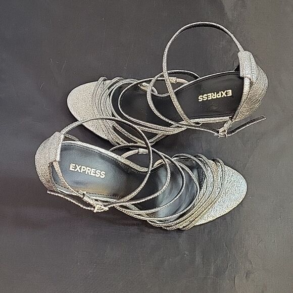BRAND NEW EXPRESS METALLIC STRAPPY HIGH HEEL OPEN TOE SANDAL SIZE 9 COLOR SILVER ADJUSTABLE BUCKLE ANKLE STRAP MULTI STRING STRAP MADE WITH ALL MAN MADE MATERIALS HEEL HEIGHT MEASUREMENTS APPROX 4"INCHED THIS ITEMS IS BRAND NEW WITHOUT TAG CHECK THE PICTURES