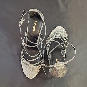 BRAND NEW EXPRESS METALLIC STRAPPY HIGH HEEL OPEN TOE SANDAL SIZE 9 COLOR SILVER ADJUSTABLE BUCKLE ANKLE STRAP MULTI STRING STRAP MADE WITH ALL MAN MADE MATERIALS HEEL HEIGHT MEASUREMENTS APPROX 4"INCHED THIS ITEMS IS BRAND NEW WITHOUT TAG CHECK THE PICTURES