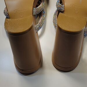 BRAND NEW FOREVER SLIPPERS PEEP TOE DOUBLE STRAP DIAMONTE EMBROIDERY SLIP ON STYLE BLOCK HEEL SANDAL SIZE 10 COLOR TAN SQUARE SHAPE HEEL HEIGHT MEASUREMENTS APPROX 3.15"INCHES THIS ITEMS IS BRAND NEW WITH TAG NO BOX CHECK THE PICTURES