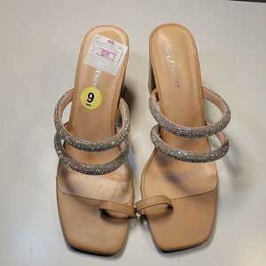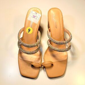 BRAND NEW FOREVER SLIPPERS PEEP TOE DOUBLE STRAP DIAMONTE EMBROIDERY SLIP ON STYLE BLOCK HEEL SANDAL SIZE 9 COLOR TAN SQUARE SHAPE HEEL HEIGHT MEASUREMENTS APPROX 3.15"INCHES THIS ITEMS IS BRAND NEW WITH TAG NO BOX CHECK THE PICTURES