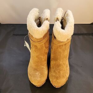 BRAND NEW GUESS DAMINA BLOCK HEEL PLATFORM BOOTS SIZE 7M COLOR TAN Give your fall-ready wardrobe a cozy-chic touch in the GUESS® Damina booties Side zipper closure.Decorative buckle strap on shaft. Stud detailing along the welt. Classic round toe silhouette.Platform block heel.Leather and faux-fur upper. Faux-fur and man-made lining. Man-made outsole.Product measurements were taken using size 8.5, width M. Please note that measurements may vary by size.