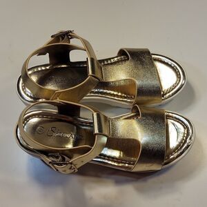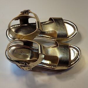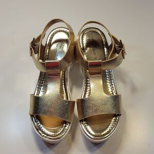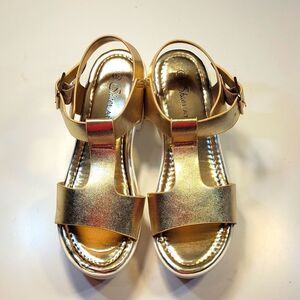 BRAND NEW HERSTYLE CERTAIN LE WEDGE ANKLE STRAP OPEN TOE PLASFORM SANDAL SIZE 6 COLOR GOLD &WHITE MADE WITH ALL MAN MADE MATERIALS PLASFORM HEIGHT MEASUREMENTS APPROX 3"INCHES THIS ITEMS IS BRAND NEW WITH TAG AND BOX CHECK THE PICTURES