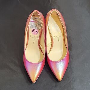 BRAND NEW JESSICA SIMPSON CASSANI POINTED TOE RAINBOW MULTI WOMEN"S PUMP SHOE SIZE 5 1/2M COLOR PINK YELLOW HEEL HEIGHT MEASUREMENTS APPROX 3.75"INCHED MADE WITH MADE WITH TEXTILE UPPER MAN MADE LINING TEXTILE AND MAN MADE THIS ITEMS IS BRAND NEW WITH TAG CHECK THE PICTURES