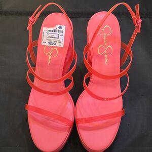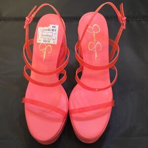 BRAND NEW JESSICA SIMPSON CHOLENA PLATFORM WEDGE SANDAL SIZE 9M COLOR ORANGE material Rubber Outer material Polyurethane (PU) Closure type Buckle Synthetic Material Platform Buckle Closure Jessica Simpson Cholena Platform Wedge Sandal Step up your style with these vibrant pink platform wedge sandals. Perfect for adding a pop of color to any outfit.heel height measurements approximately 51/2"inched THIS ITEMS IS BRAND NEW WITH TAG NO BOX CHECK THE PICTURES