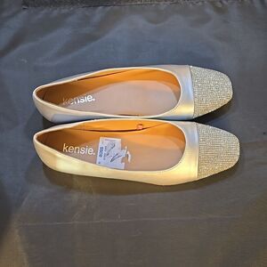 BRAND NEW KENSIE FAITH EMBELLISHMENT SQUARE TOE BALLERINAS FLAT SHOE SIZE 8M COLOR SILVER A pair of silver tone square toe upper material leather upper cushioned footbed texture and patterned outsole Slip-On style THIS ITEMS IS BRAND NEW WITH TAG CHECK THE PICTURES