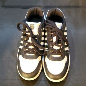 BRAND NEW K-SWISS KID UNISEX BLACK & WHITE COURT PALISADES SNEAKERS SIZE 5 Sole material Rubber Outer material leather closure type Lace-Up Leather Upper Textile Collar Lining Court Palisades sports shoes designed by K-Swiss, made of high-quality genuine leather. The model stands out with the iconic for the brand contrasting stripes on the side panels and accent logo print on the tongue.Model with ties Contrasting suede inserts Perforations on the side panels and in front Contrasting sole with embossed logo Contrasting stripes on the side panels Logo print on the tongue Composition genuine leather Sole rubber THIS ITEMS IS BRAND NEW WITHOUT TAG CHECK THE PICTURES