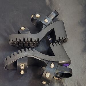 BRAND NEW GIRL MADDEN CRYSTAL LEATHER PLASFORM HEEL SANDAL  OPEN TOE SANDAL  SIZE 8 1/2 COLOR BLACK &GOLD TREAD SOLE DETAIL ANKLE STRAP WITH BUCKLE CLOSURE THIS ITEMS IS BRAND NEW WITH TAG CHECK THE PICTURES(You won't have to tread lightly in STORRM. This tread sole sandal features oversized jewels that are sure to add some edge and glamour to your look!)