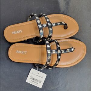 BRAND NEW MIXIT 3-STRAPS THONG WOMEN"S STUDDED DETAILING ROUND TOE SANDALS SIZE 6 1/2 COLOR BLACK &BROWN BOTTOM Slip-On Shoe Heel Height: 1/4 Inch Upper/Outer Base Material: 55% Polyurethene, 45% Metal Shoe Lining Material: Polyurethane Sole Material Content: 55% Polyester, 45% Thermoplastic-Rubber Toe Type: Open Toe Heel Style: Flat Heel THIS ITEMS IS BRAND NEW WITH TAG CHECK THE PICTURES