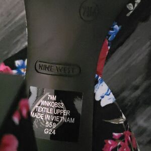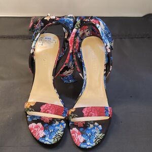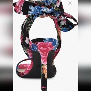 BRAND NEW NINE WEST KOBS ANKLE BOWNOT TIE SANDAL (WOMEN) SIZE 71/2M MULTI-COLOR LIKE ORANGE GREEN, BLACK AND MORE ankle tie furthers the sweetness of a floral-patterned sandal lofted by an architectural heel for on-trend styling.heel height measurements approximately 3" 3/4"inched heel Textile upper/synthetic lining and sole These elegant high-heeled sandals showcase a striking design with a wide ankle strap that ties into a stylish bow on the side. The unique sculptural heel adds a modern flair, making them perfect for any occasion.THIS ITEMS IS BRAND NEW WITH TAG NO BOX CHECK THE PICTURES