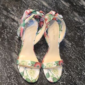 BRAND NEW NINE WEST KOBS ANKLE BOWNOT TIE SANDAL (WOMEN) SIZE 6M MULTI-COLOR LIKE GREEN, RED,WHITE AND MORE ankle tie furthers the sweetness of a floral-patterned sandal lofted by an architectural heel for on-trend styling.heel height measurements approximately 3" 3/4"inched heel Textile upper/synthetic lining and sole These elegant high-heeled sandals showcase a striking design with a wide ankle strap that ties into a stylish bow on the side. The unique sculptural heel adds a modern flair, making them perfect for any occasion.THIS ITEMS IS BRAND NEW WITH TAG NO BOX CHECK THE PICTURES