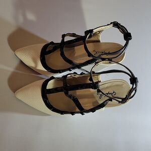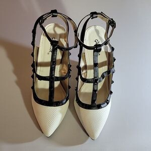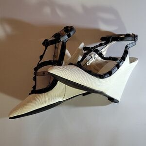 BRAND NEW QUPID POINTED TOE 'ROCKTUD" CAGET LEATHER PUMP WEDGE SHOE SIZE 6 COLOR BLACK &WHITE MADE WITH ALL MANMADE MATERIALS BRAND NEW WITH TAG CHECK THE PICTURES JUST CLOSET WEAR