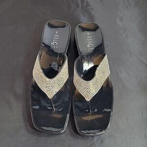 BRAND NEW ROUGE RHINESTONES EMBELLISHMENTS SQUARE TOE SLIP-ON BLOCK THONG SANDAL SIZE 9 COLOR BLACK &SILVER MADE WITH ALL MAN MADE MATERIALS HEEL HEIGHT MEASUREMENTS APPROX 2"INCHES THIS ITEMS IS BRAND NEW WITH TAG AND BOX CHECK THE PICTURES