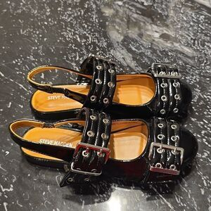 BRAND NEW STEVE MADDEN KIDS GIRLS J-GRAYAA SLINGBACK SANDALS SIZE 3 COLOR BLACK Introduce your child to style and comfort with kids' J GRAYAA These stylish slingback flats feature a trendy square back with grommets and buckles for an edgy touch. The perfect combination of fashion and practicality, these flats will keep your child's feet comfortable all day long.5 inch heel height Vegan leather upper material Vegan leather lining Vegan leather sock Synthetic sole Steve Madden, the Girls' J-Grayaa Slingbacks feature Synthetic patent upper Wide grommet straps over top and toe with oversized buckle hardware Slip-on style with slingback strap Synthetic lining Rubber blend outsole THIS ITEM IS BRAND NEW WITH TAG NO BOX CHECK THE PICTURES