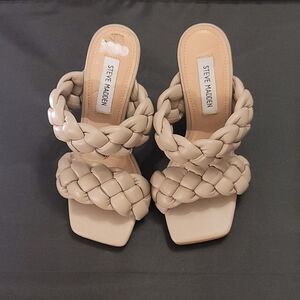 Material Man Made/SyntheticChunky woven straps add chic dimension to the dressy lift of Steve Madden's Kenley stilettos.4-1/2" stiletto heel Square-toe slip-on dress sandals Woven braided detailing at straps Manmade upper manmade lining manmade soleTHIS ITEMS IS BRAND NEW WITH TAG CHECK THE PICTURESS