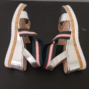 BRAND NEW STEVEN BY STEVE MADDEN WOMEN'S NC SARIA WEDGE SANDAL SIZE 8 COLOR SILVER with multi color strap like green, white,red Textile and Synthetic Sole material Rubber Platform height 1 inches Wedge Heel Fabric UpperThis wedge sandal stands tall with a rubber and cork sole, while criss crossed printed straps add some extra flair.Ready to add a little sophistication to your look? Then graduate on to Steven footwear by Steve Madden. These styles are a perfect combination of youthful colors and mature designs. Let these sleek, unique designs carry you into a new world of fashion with all the comfort and flair you've come to expect from Steve Madden.THIS IS A BRAND NEW WITHOUT TAG CHECK THE PICTURES