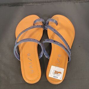 BRAND NEW UNISA UNDERLIAH-R GLASS STONE DOUBLE STRAP OPEN TOE SANDAL SIZE 6M COLOR ROYAL BLUE balance man made materials Understated,sandals combine shimmering rhinestones and an asymmetrical design. Product Features Round open-toe slide-on thong sandals Rhinestone embellishment; padded sock for added comfort Fabric upper manmade sole material round toe Slip-on style THIS ITEMS IS BRAND NEW WITH TAG NO BOX CHECK THE PICTURES