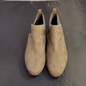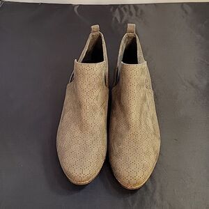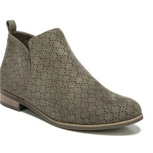 BRAND NEW WOMEN"S DR.SCHOLL'S RATE ANKLE BOOTIES SIZE 9.5W COLOR OLIVER GREEN Tiny perforations in an subtle geometric pattern define an essential bootie fitted with a Memory Foam Cool Fit footbed and grounded by a modest stacked heel. Sizing: True to size. M=standard width Round toe - Side cutouts - Pull-on style - Memory Foam footbed - Low block heel - Approx. 3.15" shaft height - Approx. 1" heel - Imported Spot Clean Textile upper/synthetic lining and sole SUSTAINABLY CRAFTED: Eco-conscious fabric toe box, linings and topcloth made from recycled bottles, and heel counter made from recycled materials MATERIALS: Microfiber made from recycled bottles FIT: Slip-on fit with back pull tab and deep side chopouts for easy on/off SUSTAINABLE COMFORT: Insole Technology with anatomical cushioning, comfort & support MOVEMENT: Lightweight, flexible construction moves with you STYLE: Sleek round toe bootie with perforated accents and 1 inch stacked heel Geometric perforated detailing and a deep chop-out give this bootie standout status. Wear it endlessly with everything from shorts and jeans to dresses. THIS ITEMS IS BRAND NEW WITHOUT TAG CHECK THE PICTURES