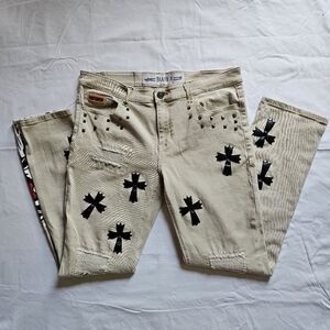 BRAND X beige distressed cross embellished skull print unique streetwear jeans
