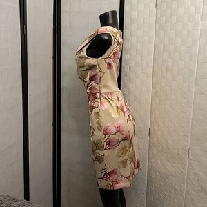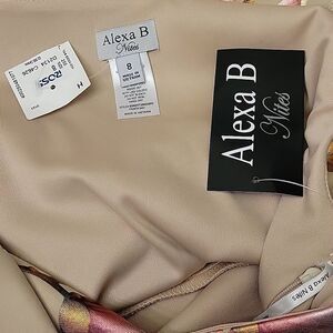 BRAND NEW ALEXA B NITES SLEEVELESS CRISSCROSS V-NECK METALLIC FLORAL DESIGN DETAILS SHEATH DRESS 8 COLOR TAN WITH GOLD&ORANGE SHIMMER FLORAL PATTERN EMBELLISHMENTS HIDDEN SIDE ZIPPER CLOSURE KNEE LENGTH MADE WITH SHELL 95%POLYESTER &5%SPANDEX LINING 100%POLYESTER THIS ITEMS IS BRAND NEW WITH TAG CHECK THE PICTURES