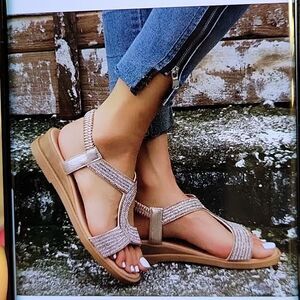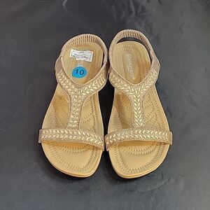 BRAND NEW ASHLEY BLUE RHINESTONES EMBROIDERY EMBELLISHMENTS ELASTIC BAND FISH MOUNT OPEN TOE WOMEN"S SANDAL SIZE 10 COLOR TAN MADE WITH ALL MAN MADE MATERIALS THIS ITEMS IS BRAND NEW WITH TAG CHECK THE PICTURES