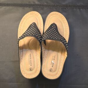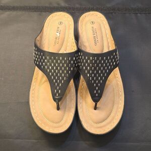 BRAND NEW COMFORT BY ALEXIX BENDEL JEWEL DESIGN THONG WEDGE WOMENS SANDAL SIZE 9 COLOR BLACK WITH CORK BOTTOM WEDGE Women Sandals Fashion Summer New Pattern Roman Sandals Flip Flops Comfortable Wedge Casual Shoes Nine Sandals for Women Step out in style with these all man-made materials lining man-made material cut out design Heel Height measurements approximately 21/2"inched THIS ITEM IS BRAND NEW WITH TAG NO BOX CHECK THE PICTURES OF