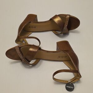 BRAND NEW DIBA LEATHER HEELS with CRISSCROSS STRAS SANDAL SIZE 71/2W COLOR BROWN These Diba heels feature a rich brown leather one strap rhinestones construction with a stylish crisscross strap design and secure ankle buckle closures. The open-toe style and elegant heel make them a versatile choice for both casual and formal occasions.all man-made materials lining man-made material open toe low block heel adjustable buckle strap closure heel height measurements approximately 21/2"inched THIS ITEMS IS BRAND NEW WITH TAG NO BOX CHECK THE PICTURES OF THE PICTURES