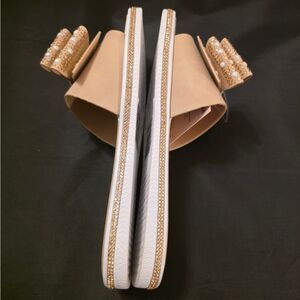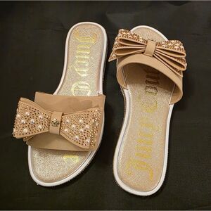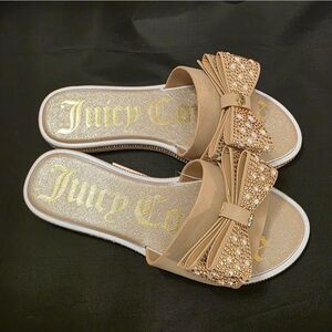 BRAND NEW JUICY COUTURE YAEL BOWNOT PEARL RHINESTONE SLIDER SIZE 6M COLOR TAN This is a pair of Juicy Couture The sandals feature a slip-on style with a bow design adorned with rhinestones on the side. They have a flat heel height, making them comfortable for casual wear during the summer, fall, and spring seasons. The lightweight and breathable design, along with the foam insole, ensures comfort for all-day wear with comfort this sandals also showcase the Juicy Couture logo, adding a touch of branded style to your outfit.THIS ITEMS IS BRAND NEW WITH TAG NO BOX CHECK THE PICTURES