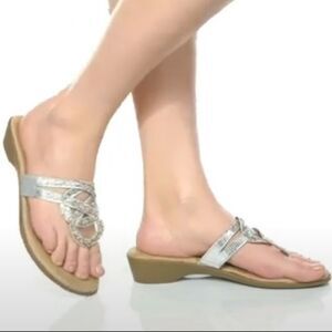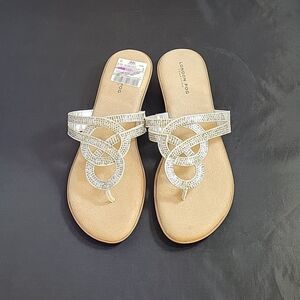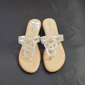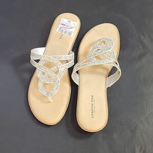 BRAND NEW LONDON FOG ELYSSA HEELED SANDALS SIZE 10M COLOR SILVER METALLIC The easy to wear London Fog Elyssa Heeled Sandals are a must-have in one's closet. Textile upper Man-made lining.Memory foam cushioned insole.T-strap design upper.Slip-on closure.Textile and synthetic outsole. Product measurements were taken using size 7.5, width M. Please note that measurements Heel Height: 1 3⁄10 in Weight: 7 oz THIS ITEM IS BRAND NEW WITH TAG NO BOX CHECK THE PICTURES