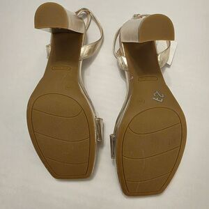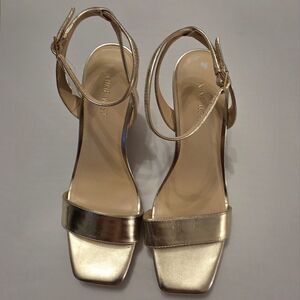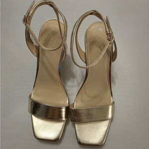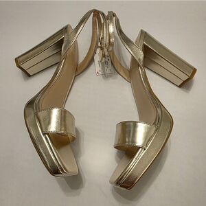 BRAND NEW NINE WEST BLOCK HEEL SANDAL with ANKLE STRAPS SIZE 10M COLOR GOLD your style with these block heel sandals, featuring a chic ankle strap and a comfortable platform sole. The metallic finish and minimalist design make Classy and essential the Elope sandal will be a go-to shoe for all events. This sky-high block heel sandal features a toe strap and adjustable ankle strap.Heel height 3.43"block heel Shoe width medium Buckle closure Platform height 0.59"Almond and open toe Upper Faux Patent Leather Polyurethane Lining and sole Man made elegance and stability.Classy and essential, the Elope sandal will be a go to shoe for all events. This sky-high block heel sandal features a toe strap and adjustable ankle strap.THIS ITEMS IS BRAND NEW WITH TAG NO BOX CHECK THE PICTURES(FYI THE FIRST PICTURES IS JUST A MODEL TO SHOW WHAT THE SHOE LOOK ON YOUR FEET CHECK THE PICTURES)